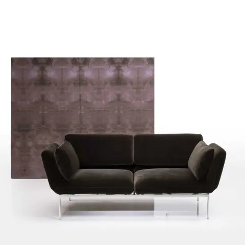 Mit seinen glatten, schlanken Konturen und den leicht abgerundeten Polstern wirkt das Sofa elegant und geschmeidig. Helle Bezüge und zusätzliche Tischmodule an den Seiten machen es besonders grazil und luftig. Das zweisitzige Sofa bietet zwei separat zum Entspannen oder Liegen einstellbare Drehsitze. In der Liegeposition wird das Sofa zum komfortablen Ruhelager von 133 x 200 cm, während es sich durch Absenken der Armlehnen zur Seite rasch zum Daybed wandelt. Optionale Rollen am Untergestell sorgen für leichtere Beweglichkeit.
