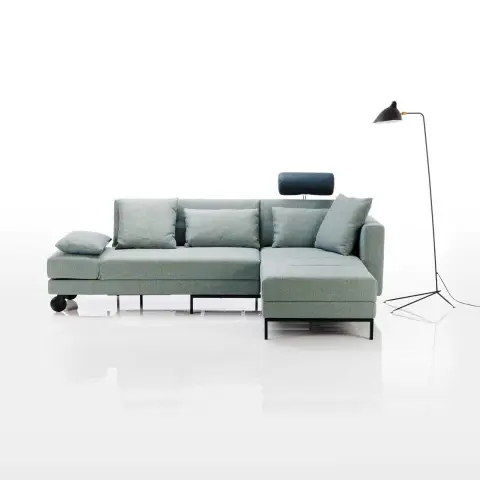 Multifunktionssofa Brühl four two für kleine Räume: Erhältlich in Soft- und Compact-Varianten vereint es weiche, legere oder betont glatte und etwas festere Oberflächen mit klaren Außenkonturen und gemütlicher Polsterung. Es kann als kompakte Ecklösung mit Platz für vier Personen, als Lounge-Bereich oder als bequemes 150 x 210 cm großes Doppelbett genutzt werden. Das Drehsofa kann nach rechts oder links ausgerichtet werden. Unter der Armlehne des Sofas befindet sich eine Ablagefläche für den Tisch. Die -Armlehne des Longchairs wird der zusätzlichen Rückenlehne vorgezogen.Zusätzliche Optionen wie Kopfstützen oder Tischmodule, die bei der Nutzung als Bett praktisch sind, machen es zu viert oder zu zweit noch bequemer. Grundstruktur aus Metall oder Holz. Mit Stoff oder Leder gepolstert, abnehmbare Bezüge.