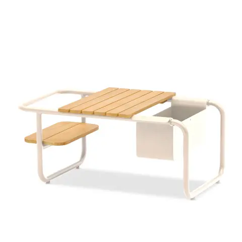 Dank des pulverbeschichteten Aluminiumgestells ist der Outdoor-Couchtisch leicht, stabil und witterungsbeständig. Die langlebige Teakholzplatte überzeugt durch ihren natürlichen Look und ihre Widerstandsfähigkeit, was den Tisch ideal für den Einsatz im Außenbereich macht – selbst bei wechselnden Wetterbedingungen bleibt er zuverlässig und formschön. Erhältlich in den Farben Graphite, Light Taupe und Sage.