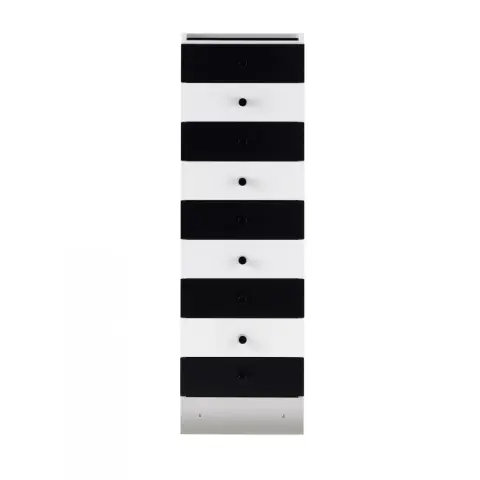 Ein Entwurf, so einfach wie nachvollziehbar: Marcel Breuer stapelte für die Kommode S43 neun Schubladenelemente und markierte sie alternierend in Kontrastfarben: Schwarz und Weiß. Die schwarz lackierten zylindrischen Griffe wiederum verschmelzen so entweder mit der ebenfalls schwarzen Front oder heben sich deutlich ab. Ein Rhythmus entsteht, der durch die schwarze Glasplatte der Ablage wieder zur Ruhe kommt. Hier zeigt sich ein nützliches Detail: Die leicht überhöhten Ränder von Rück- und Seitenflächen sorgen dafür, dass keine Stifte von der Kommode rollen.