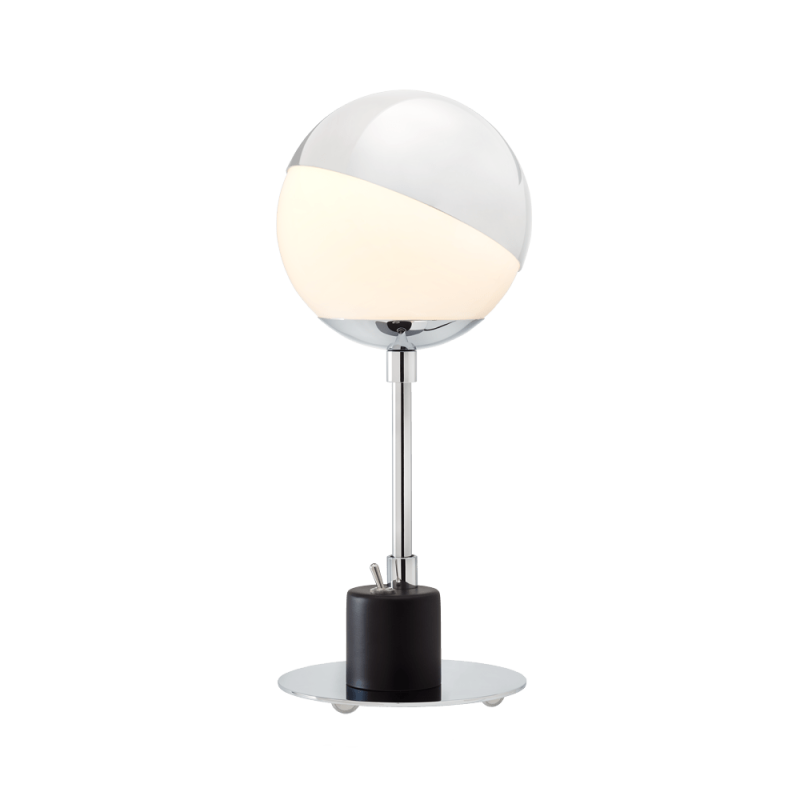 Die polierte Aluminiumkappe hält sich auf der Glaskugel allein durch die Reibung. Durch Verschieben kann man diesen Reflektor jederzeit blendfrei einstellen. Die Reduktion auf die einfachsten der zur Funktion nötigen Formen Kugel und Zylinder kennzeichnet das Design dieser heute noch praktisch zu verwendenden Tischlampe.